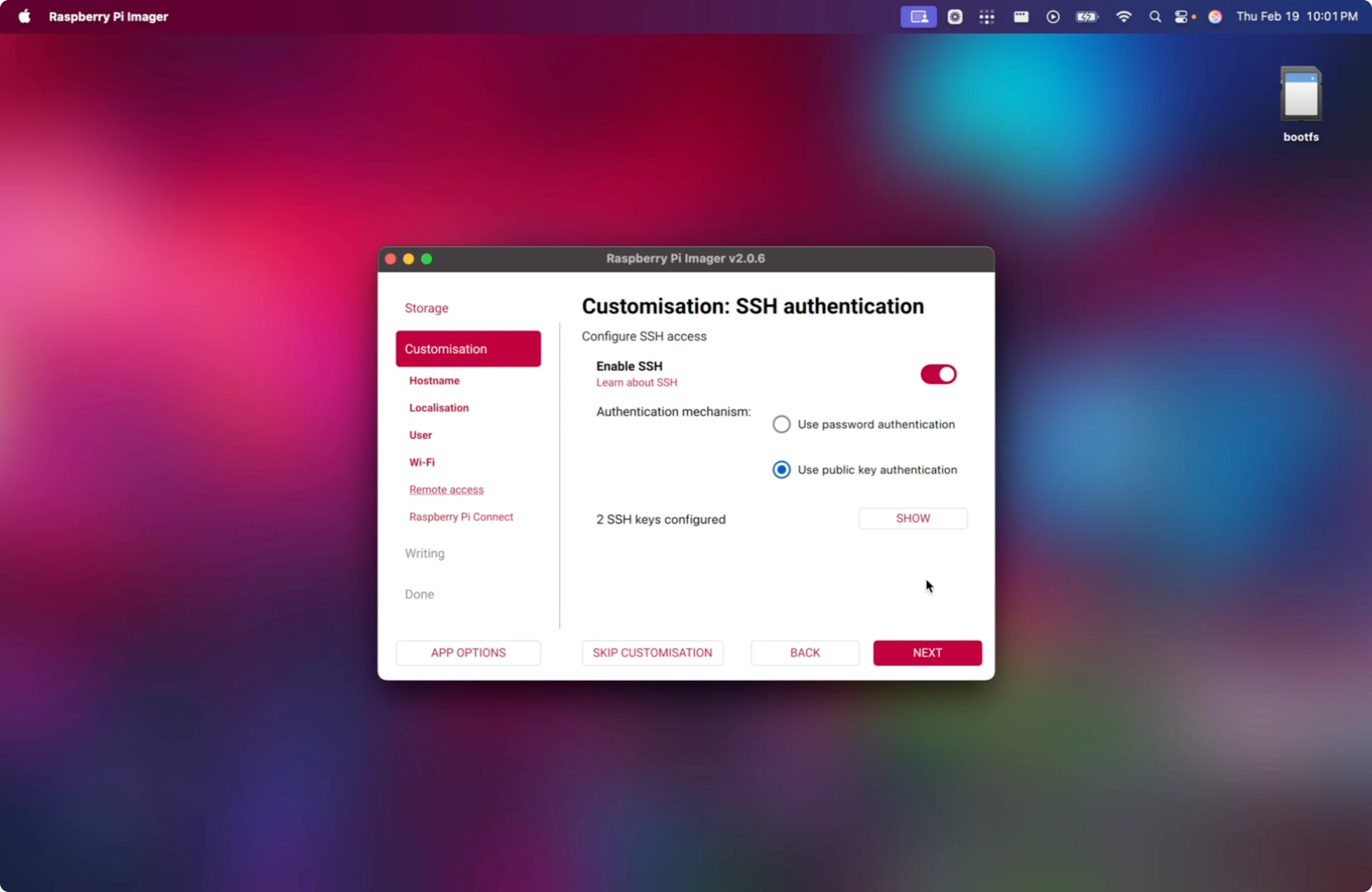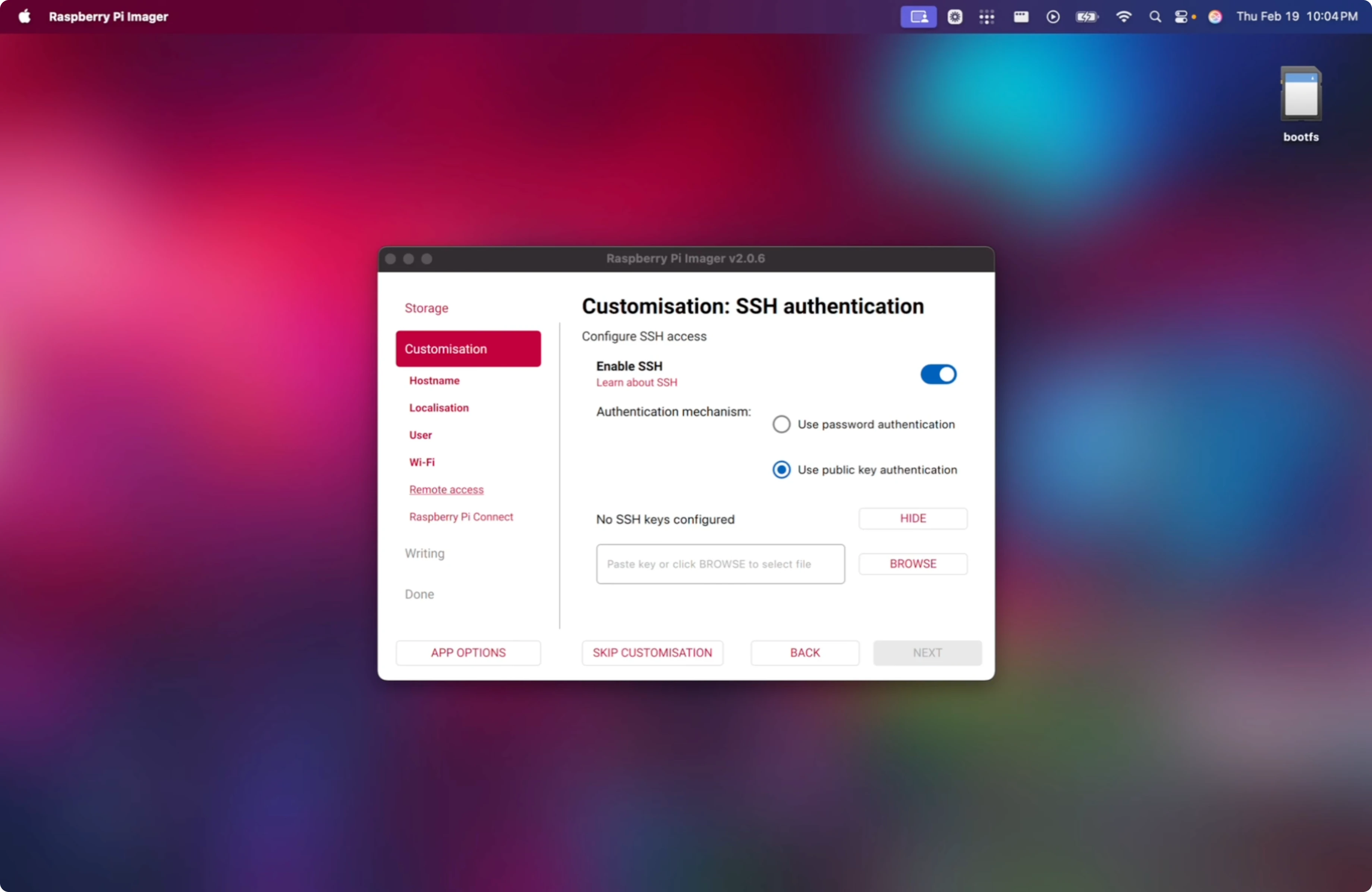 Generate a modern ed25519 SSH key on your main machine, then paste the public key into Imager when prompted.