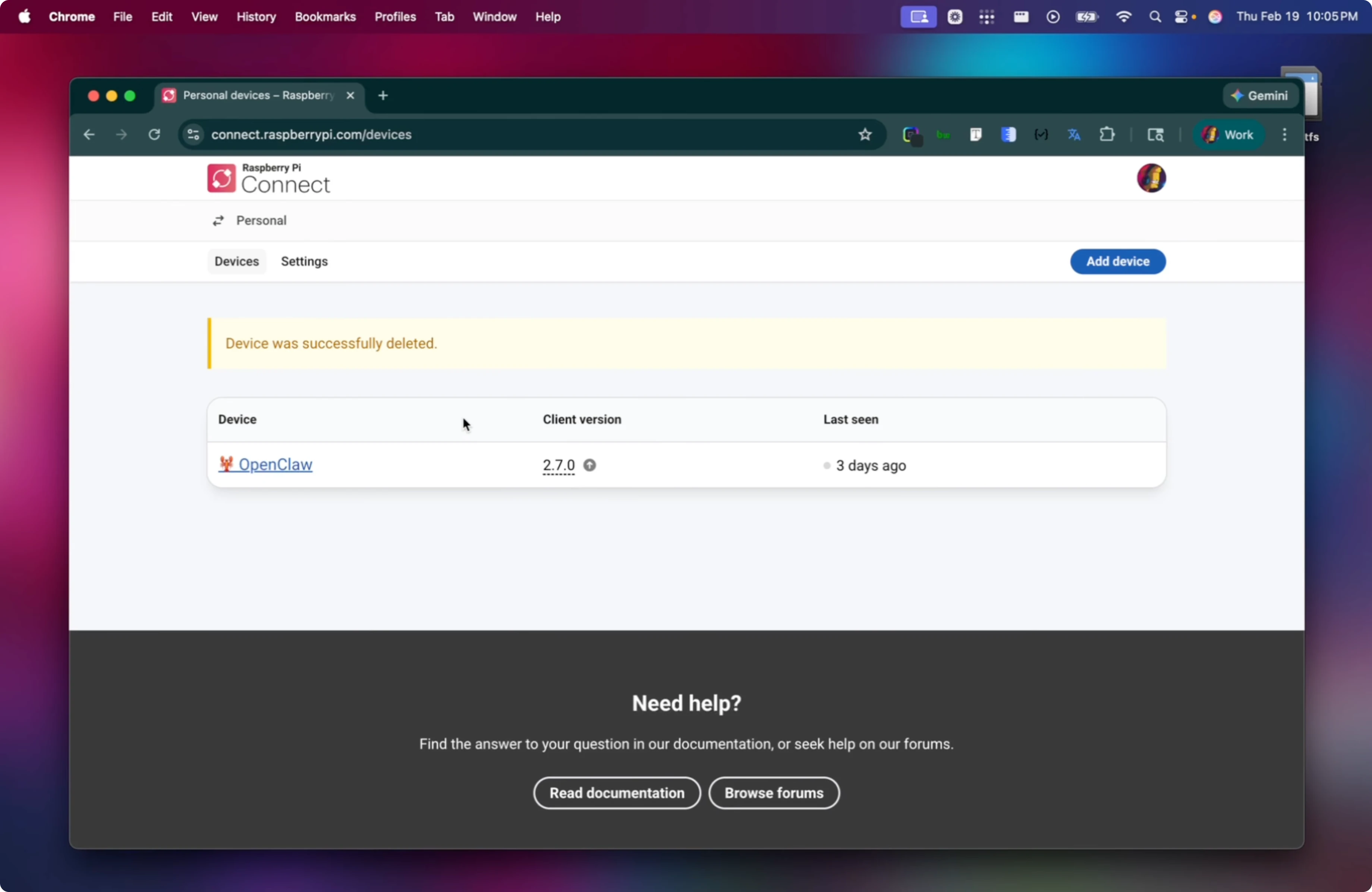 Assemble the kit, insert the SD card, connect the USB Ethernet adapter through the OTG adapter, and plug into your router. Power on the Pi Zero 2 W and give it about 5 minutes on first boot. Use Raspberry Pi Connect to confirm the device appears, then open a remote shell to grab its IP.