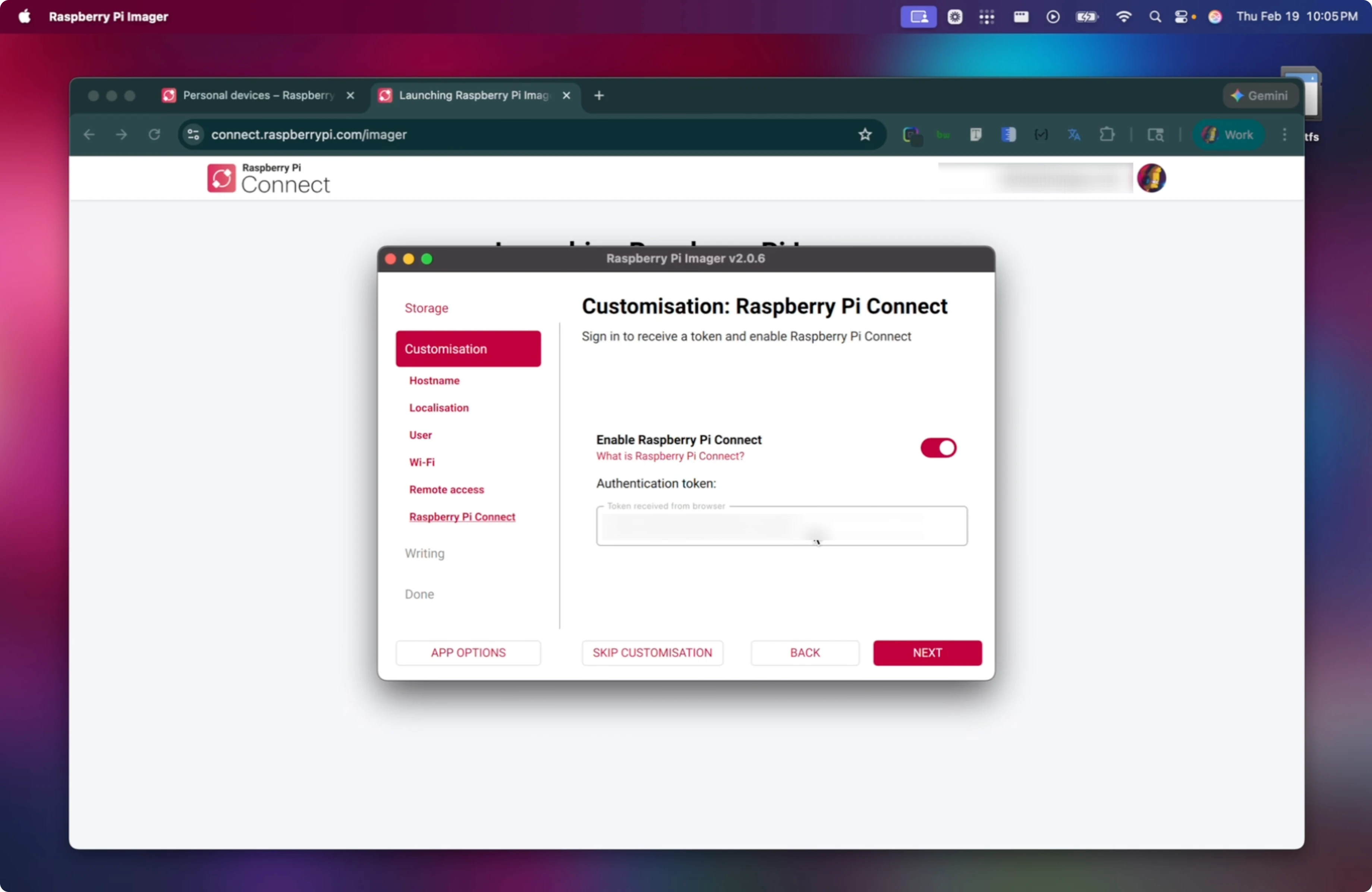 Create or fetch the auth token from your Raspberry Pi account when prompted in Imager.