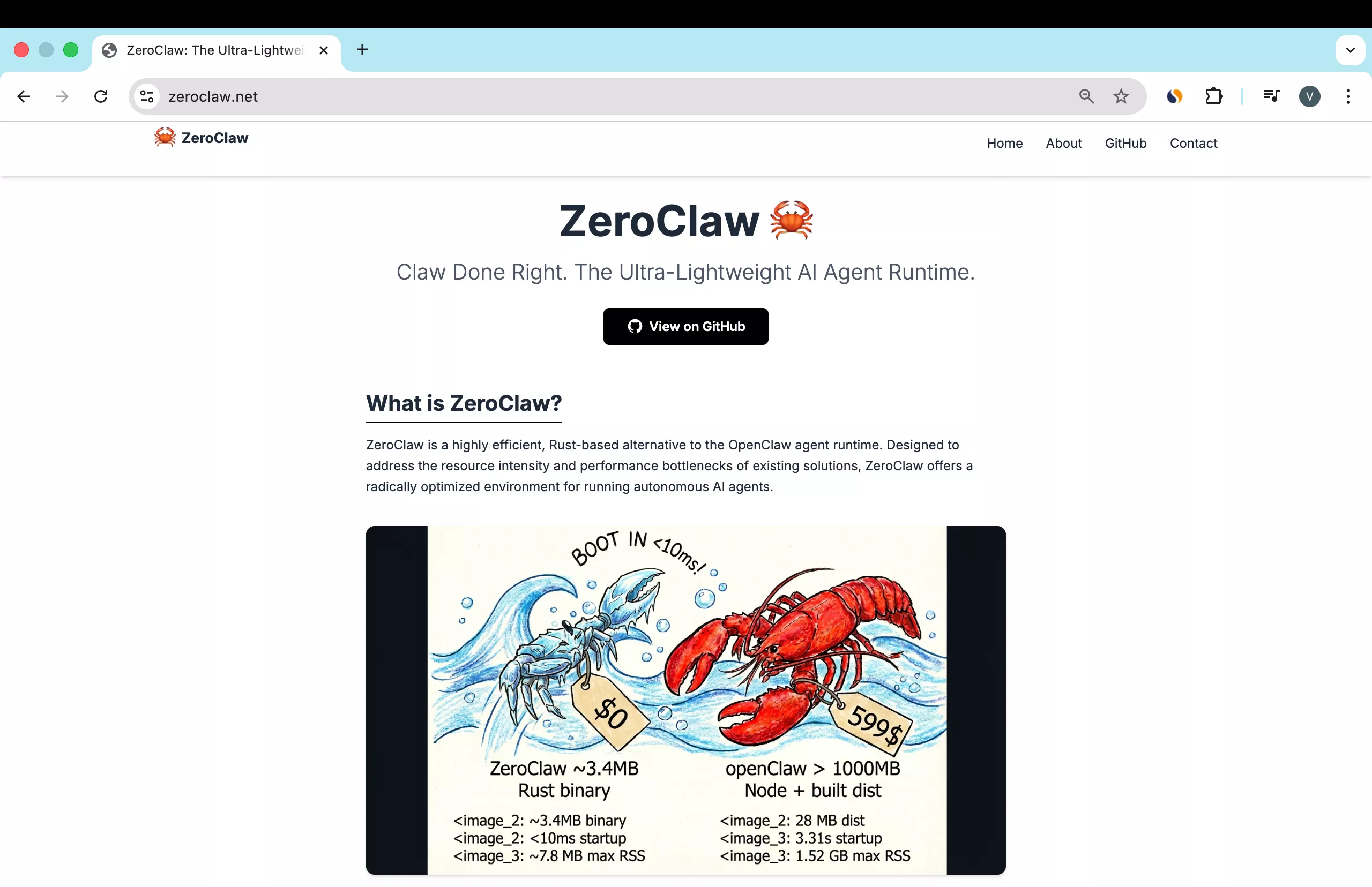 ZeroClaw runs great on a Raspberry Pi Zero 2 W because it is a single Rust binary with no runtime and no dynamic dependencies. Startup is faster, the binary is about 3.4 MB, and memory usage is extremely low. For details and news, see the site.